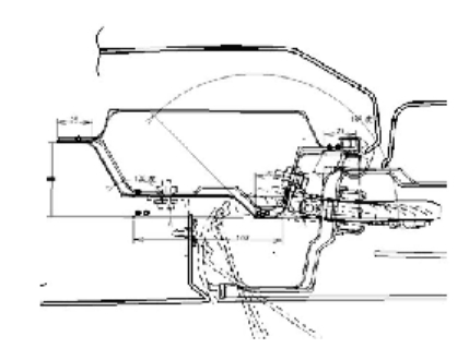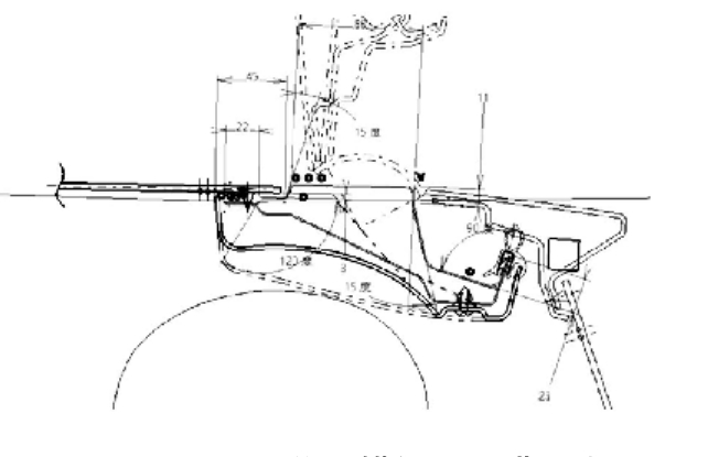 2 车身结构设计构建完车身主体架构走势后,就开始进行车身结构设计。三维数据的建立都要遵循点、线、面、体的过程,即由点生线、由线生面、由面生体的过程。所以在进行车身3D数据制作前首先会制作2D数据,即常说的典型断面。车身典型断面是车身设计过程中的一项重要工作,它能够定义零件与零件间的配合关系,指导接下来的3D数据制作,反映运动件的运动轨迹,评估初步的工艺可行性,反映截面的弯扭特性等。一般一个车身的典型断面会有几十个,本文主要展示了本车的几个主要典型断面。 (1)门上铰链位置的典型断面,如图4,断面反映了车身此处内外板及加强板的搭接形式、型面尺寸及构成角度,体现了门的运动轨迹、密封形式、铰链的固定方式以及门与翼子板的配合关系等。 (2)门限位器位置的典型断面,如图5,其主要体现了限位器的运动轨迹、安装形式,以及为了配合限位器车身钣金和门钣金所定义的相关结构及尺寸,同时也体现了翼子板为了避让门开启所定义的固定结构。 (3)门槛位置的典型断面,如图6,此断面涉及车身、开闭件、外饰件、内饰件、电器等多专业,所以此断面主要体现了门与车身、外饰件之间的配合关系,外饰件、内饰件以及电器在车身钣金和门钣金上的安装形式,以及车身钣金自身的尺寸定义等。 (4)顶盖后横梁位置典型断面,如图7,此断面是为了说明在断面设计时除了考虑结构外还要兼顾人机需求,以保证人机需求车身结构进行了相关避让,这种避让是满足性能要求和初步评估的前提。