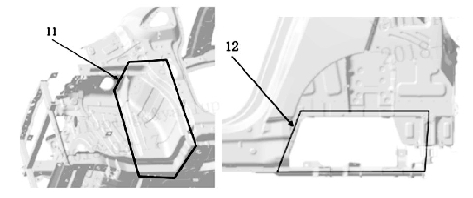 基于以上因素,在确定车身框架走势过程中考虑了主要环形结构的构建。如图1所示是本产品车身框架设计的主要的环形结构,其中大概可以分为X向(垂直于车身坐标X轴)环、Y向环和Z向环三类。其中Z向环又分为上部Z向环和下部Z向环,上部Z向环有9环(机舱上部环)、1环(前风挡环)、2环(顶盖环),下部Z向环有7环(机舱下部环)、6环(前地板框架环)、4环(后地板框架环)。Y向环主要有5环(门框环),X向环有8环(前端框架环)、10环(前围框架环)、3环(尾部框架环)。它们连接Z向上部环、Z向下部环和Y向环,形成交织的立体环状结构。除了这些主要的环以外,还有立体环形结构和隐式环形结构,图2所示的11环就是由机舱前上纵梁、A柱、前围下横梁、机舱前下纵梁、轮罩加强板和减震器固定座组成的立体环形结构,12环则是由车身梁架与底盘后副车架共同构建的一种借用了非车身零件构成的隐式环形结构。 环形结构使车身框架成为一个整体,可以优化车身弯扭刚度,可以增加车身结构的共用,可以指导车身材料向有利于保证性能的区域应用,有利于车身轻量化。