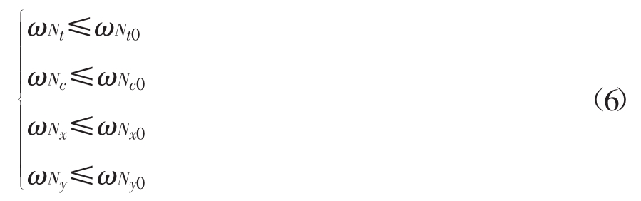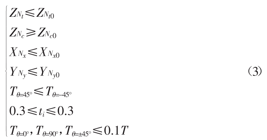 [size=1em]式中:ZNt为在拉伸工况下加载点z向的位移;ZNc为在压缩工况下加载点的z向位移;XNx是侧向弯曲工况下加载点x向的位移;YNy是在后向弯曲工况下,加载点y向的位移;T为铺层厚度;ti为单层板厚度.