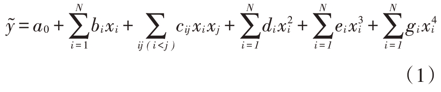 ͂为响应面拟合函数;xi(i=1,2,…,N)为设计变量;N 为变量的个数;a0,bi,cij,di,ei,gi均为待定系数。