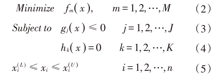 式中:xi为第i个设计变量;n为设计变量的总数;x(iL)和x(iU)为第i个设计变量取值的上限和下限;fm(x)为第m个子目标函数,M 为子目标函数的总数;gj(x)为第j 个不等式约束条件,J 为不等式约束的总数;hk(x)为第k个等式约束条件,K 为等式约束的总数。