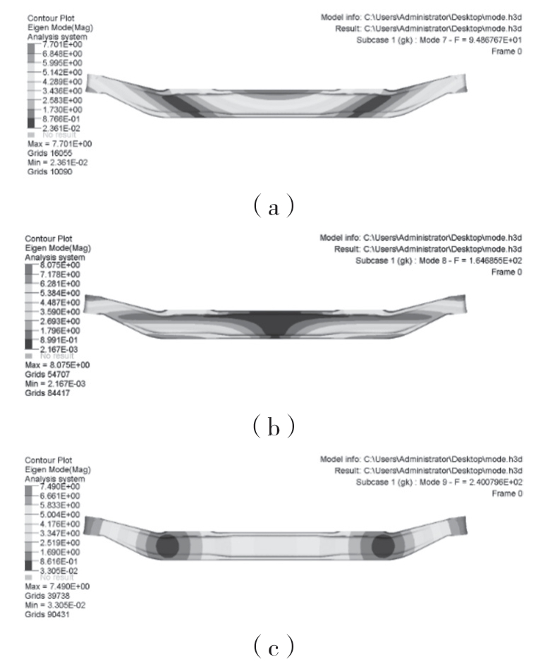 前桥模态分为自由模态和约束模态。由于前桥在约束模态下自由度减少,刚度得到提高,因而前桥约束模态频率高于自由模态固有频率。为此,对前桥不加载的情况下,也就是对前桥进行自由模态分析,求解前桥的前10 阶模态。通过分析发现,前6 阶的模态频率非常低,与零非常相近,这是因为前6 阶为刚体模态,在分析中不考虑。因此,选取从前桥第7 阶模态开始的前4阶固有频率与振型进行分析。提取前桥前4 阶模态如图4 所示。