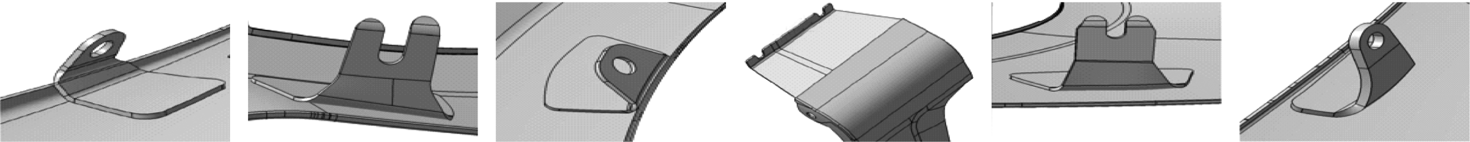 [size=0.8em](g) 新结构1 (h) 新结构2 (i) 新结构3 (j) 新结构4 (k) 新结构5 (l) 新结构6 [size=0.8em]图2 翼子板装配面 [size=1em]将设计得到的翼子板安装点结构与翼子板主体连接即可得到满足设计结构要求和制造要求的碳纤维复合材料翼子板结构。利用有限元方法对碳纤维复合材料翼子板性能进行仿真分析。 2 结果与讨论2.1 碳纤维复合材料翼子板有限元模型[size=1em]碳纤维复合材料翼子板在实际使用过程中主要承受静态载荷,且结构在厚度方向尺寸与其他方向尺寸相比很小,采用壳单元对翼子板主体和硬点结构进行离散化处理。使用Altair公司的Hypermesh软件进行几何清理和网格划分。网格基本尺寸为8 mm,单元类型为S4R和S3。螺栓采用刚性单元模拟,加强结构、单独成形硬点与翼子板主体连接用Coupling模拟。有限元模型见图3,壳单元总数为11 249,其中三角形单元数量为392,所占比例为3.48%。  [size=0.8em]图3 Hypermesh中翼子板有限元模型
