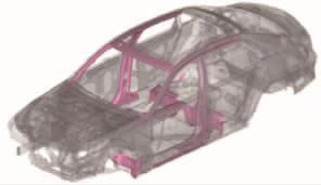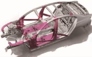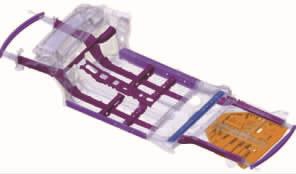 [size=1em]凯迪拉克的AB柱内板、地板中通道、横梁等关键部件均采用先进的高强钢,通过结构优化设计,使钢制下车体结构比铝制车体减重6 kg,如图2所示。  [size=0.8em]图2 凯迪拉克采用高强度钢板的AB柱内板、地板中通道、横梁等关键部件