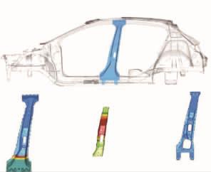 [size=1em]目前,国内汽车轻量化技术发展迅速,实现轻量化的主要措施是结构的轻量化设计和分析,结构轻量化设计已经融于汽车设计的前期。轻质材料包括铝、镁、高强度钢、复合材料及塑料在设计前期与结构设计及相应的装配、制造、防腐、连接等工艺融为一体。例如:欧宝的B柱采用热成形与差厚板结合,形成局部高强度区和局部低强度区,提高了车身刚度及吸能性,如图6所示。  [size=0.8em]图6 热成形与差厚板结合方法