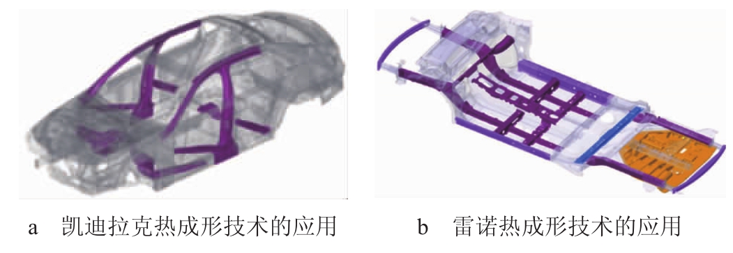 1.4 复合材料的应用[size=1em]复合材料是由2种或2种以上不同性质的材料组成,其综合性能优于原组成材料,并满足不同的要求。其中,碳纤维复合材料(CFRP)因其质量轻、高强度(钢的5倍)、高模量和良好的耐热、耐腐蚀性等特点,已成为一种非常理想的汽车轻量化材料。 [size=1em]如果1辆乘用车采用10 kg的复合材料,按照每年新车产量2 300万辆计算,车用复合材料产业将形成千亿元的市场规模。由于碳纤维复合材料制造成本过高,在汽车中的应用有限,最初仅在F1赛车、超级跑车、小批量车型上应用,如兰博基尼、柯尼塞格、雷克萨斯LFA、保时捷911 GT3承载式车身上。但随着碳纤维制造成本的下降,复合材料制造工艺的成熟,各大主机厂纷纷进行碳纤维零部件的开发,如今被广泛地应用于高级轿车上。 2 热冲压成形技术[size=1em]热冲压成形技术是一项专门用于高强度钢板冲压件成形的新技术。通过这种方法制得的冲压件强度可以达到1 500 MPa以上,目前这项技术在国外发展迅速。热成型件可提高车身安全性、舒适性,有效减轻车身质量,控制回弹,提高零件尺寸精度。热成型件广泛应用于A,B柱、车门防撞梁、前纵梁、地板横梁、铰链加强板等关键部件。 [size=1em]凯迪拉克的A,B柱、车门防撞梁,如图4a所示,雷诺的前纵梁,地板横梁及后纵梁,如图4b所示,采用热成型件,可减重10 kg。中通道由热成形钢与铝合金材料的复合材料制成。可实现“强韧有度”,与钢材相比,可减重7 kg。  [size=0.8em]图4 热冲压成形技术在轿车上的应用