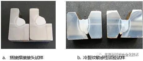 Y型坡口焊接冷裂纹敏感性试验被广泛应用于评价耐磨钢焊接性能,并根据评价结果确定是否采用预热工艺。对于19.0mm厚耐磨钢,ER50-6焊丝和二氧化碳气体保护焊接工艺被采用。在实验室分别模拟了夏天、冬季,以及80℃预热的焊接评价试验。表3给出了主要焊接参数和检验结果,图7. a给出了搭接接头焊接试样照片。