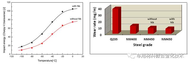 a. 夏比冲击韧性 b. 磨损率对比结果 图 6 含铌耐磨钢和不含有铌耐磨钢冲击韧性和磨损率对比结果