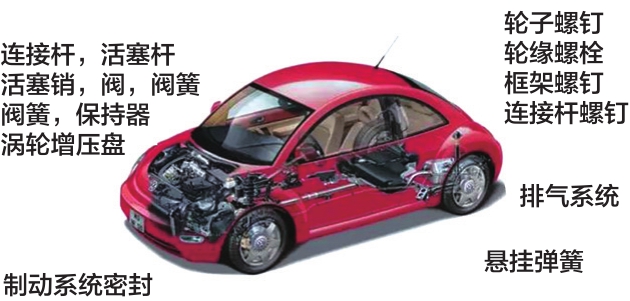 2 钛合金特点[size=1em]金属钛在地球中含量0.42%,在元素周期表常用结构金属中位于铝、铁、镁元素之后,含量丰富。但其制备困难,生产成本高,这也是其英文名称Titanium的由来,一方面说明其性能优异,另一方面又形容其难以从矿石中被提炼出来。钛及钛合金在汽车工业上应用的最大问题是其高昂的价格。它的价格通常是钢的100倍,铝合金的10倍左右。钛合金材料的力学性能和疲劳性能相于传统金属有突出优势,随着冶金和制备工艺的发展,越来越受到人们的重视。 2.1 钛合金分类[size=1em]钛在应用中有纯钛及钛合金两类。钛在常温下有两种同素异晶结构,分别为密排六方的α-Ti与体心立方的β-Ti。为了进一步提高钛的性能,常常加入合金元素进行强化,形成钛合金,主要强化元素有Al、Sn、V、Cr、Mo、Mn等。按照常温下钛合金的各项所占的比例分数,可以将钛合金分为α钛合金,近α钛合金,α+β钛合金和β钛合金四类。其中应用最为广泛的是α+β钛合金,其代表产品为Ti-6Al-4V。 2.2 钛合金性质[size=1em]钛的密度我们一般认为是4.51g/cm3,大约为铁的三分之二,是比较轻质的金属。熔点为1668℃,比铁、镍都高,可以作为耐热材料[3]。钛合金的强度高,传统的钛合金强度大多在800-1200MPa之间,经过时效强化的钛合金强度可以达到极高的水平,在1600MPa左右。塑性较好,而且有很好的疲劳强度,耐高温性能也优于一般金属。 3 钛合金零件在汽车上的应用[size=1em]目前,发动机的各种零件中利用钛合金制造的零件主要有:发动机连杆、凸轮轴、进/排气阀、气门弹簧座以及一些重要的汽车三大件配套零件,如涡轮增压盘、各种螺栓、发动机的关键密封件等。图2清楚的表明了现在或者将来钛合金能够应用到汽车上的零部件分类[4]。主要从下面几个方面说明钛合金在汽车零部件应用的优劣势。  [size=0.8em]图2 钛合金在汽车中的应用部位