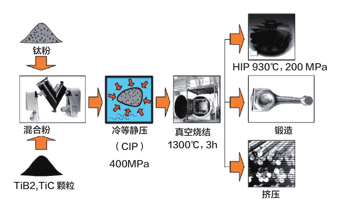 4.2 钛合金的加工[size=1em]由于钛合金具有的特殊的物理和化学性能,其机加工存在一些限制。钛的热导率低,弹性模量较低,而且硬度也较低,化学活泼性较高,这就在加工过程中,不可避免的要采用大量切削液以起到快速冷却的效果;采用特殊的夹具来减轻回弹带来的工件尺寸问题;加工前也应有特殊的表面处理来去除氧化皮。 [size=1em]钛合金的焊接性能良好,是比较适宜采用焊接工艺的金属。但由于化学活泼性高,通常采用气体保护焊,以避免焊接对零件造成强度下降等缺陷。 [size=1em]对于铸造,由于其材料利用率高,可以生产出形状复杂的零件,被广泛应用于钛合金零件的加工制造中。其中熔模铸造可以生产尺寸精度高、表面质量好的零件,主要应用于航空航天和民用的高性能零件上。如汽车发动机上的连杆等均是铸造而成。 [size=1em]此外,现代加工工艺比较成熟且大规模应用的就是粉末冶金,在材料加工和先进制造领域有很广泛的应用,尤其是在钛合金领域发挥着越来越重要的作用,我们将钛材料制成粉末状利用近成型技术可以直接制造汽车零部件,用这种方法可以有效降低原材料的损失,大幅减少制备时间,成本比常规工艺可节省20%~50%[7]。示意图5展示了粉末冶金技术在车用钛合金零部件制备流程。主要是混合钛粉和TiB2,TiC产生混合粉末,然后再400MPa工况下冷等静压,紧接着1300°高温真空烧结3小时,最后通过热等静压、锻造或挤压来成型,制备工序有所减少,制备工艺有所简化,原材料使用较少,成本降低。但是由于其制备工艺的特殊在某些性能上可能不如传统的锻造工艺。  [size=0.8em]图5 粉末冶金法生产零件