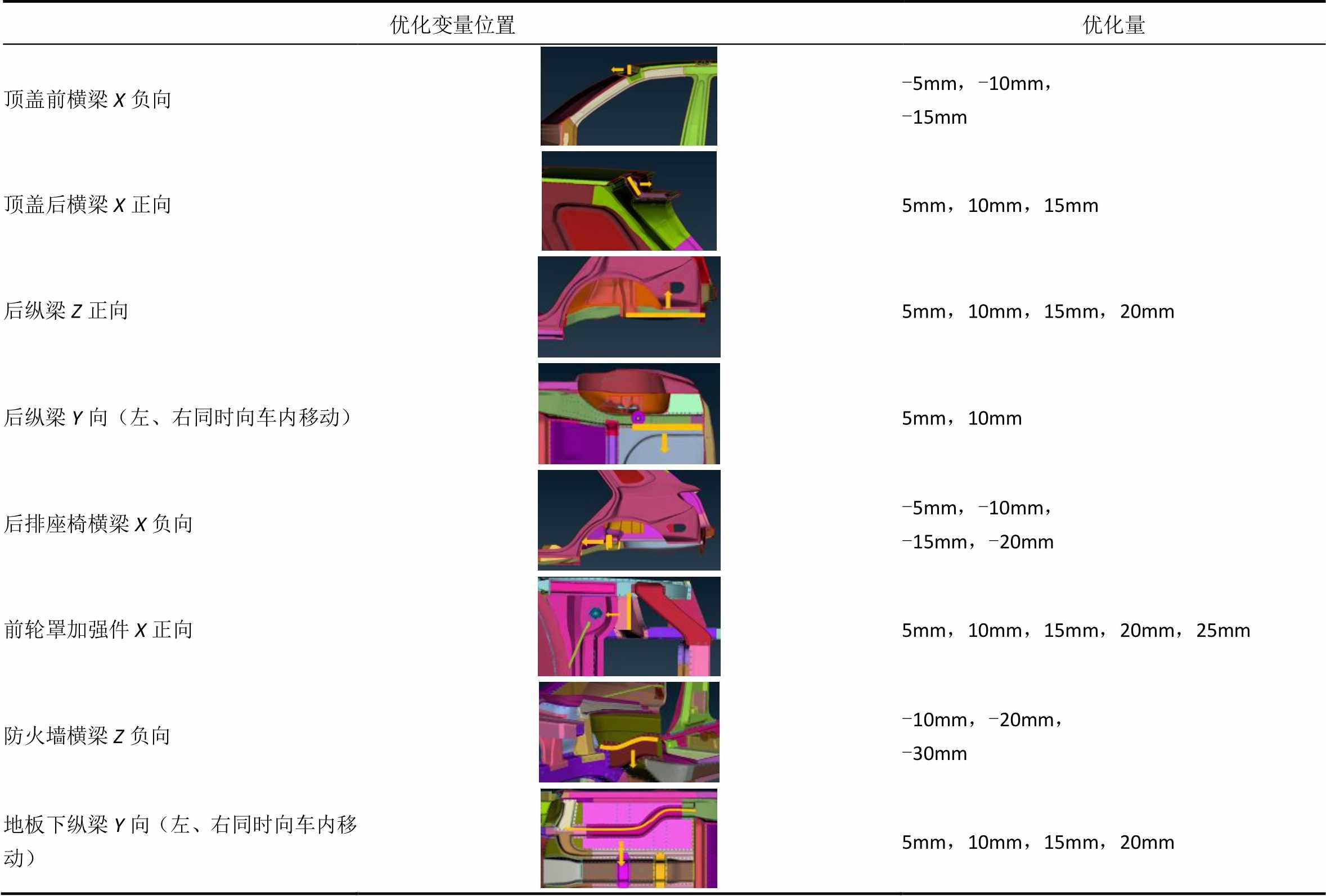 注:根据以往经验与竞品车数据确定各个变量的变化范围,其变化范围以5 mm为步距;各离散变量值以整车坐标系正向为正值,负向为负值。