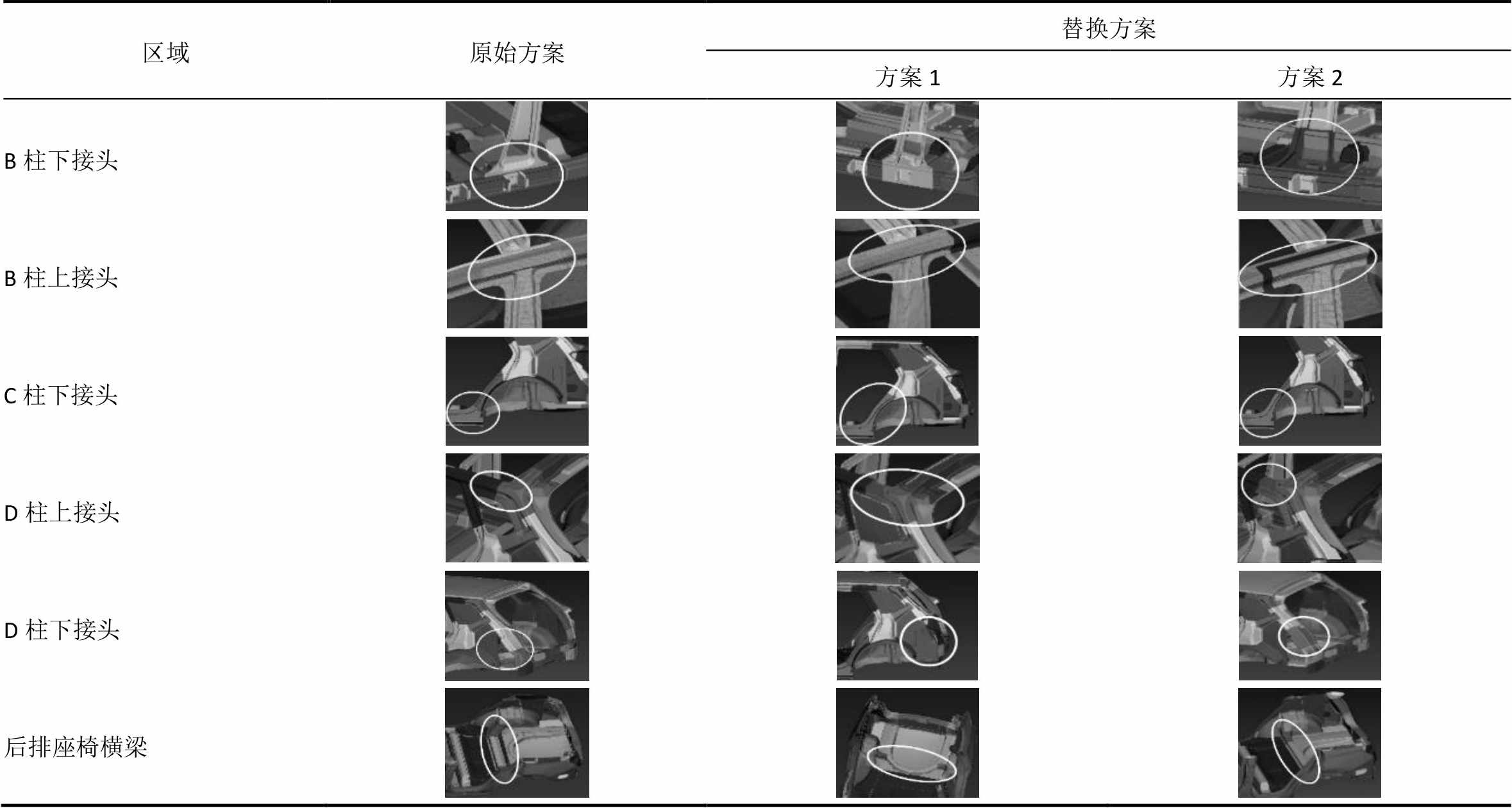 从B柱下接头、B柱上接头、C柱下接头、D柱上接头、D柱下接头及后排座椅横梁区域进行设计方案替换,每个区域均有两个替换方案,寻求更优性能。具体方案见表3。