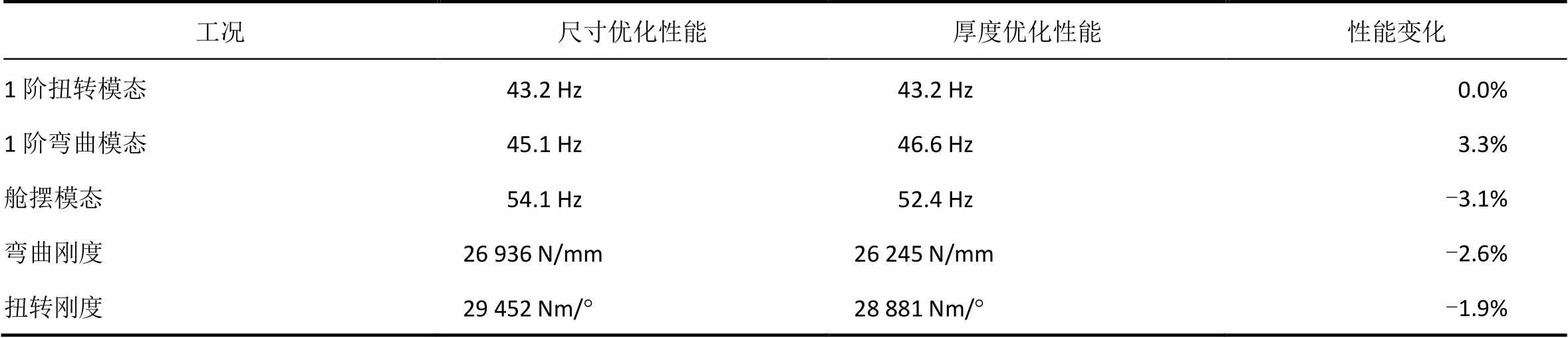 注:性能变化为厚度优化性能与尺寸优化性能的差值与尺寸优化性能的比值。