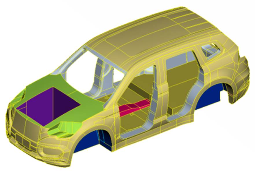 为实现从无到有的过程,通过造型外CAS(Concept A Surface,汽车初步造型面)及布置要求,制定车身拓扑空间,获得考虑模态、刚度及碰撞工况下的车身载荷传递路径;结合此路径,形成初版车身结构形式布置方案。利用SFE- Concept隐式参数化建模技术实现布置方案的数字化与参数化,并得到初版的车身性能。