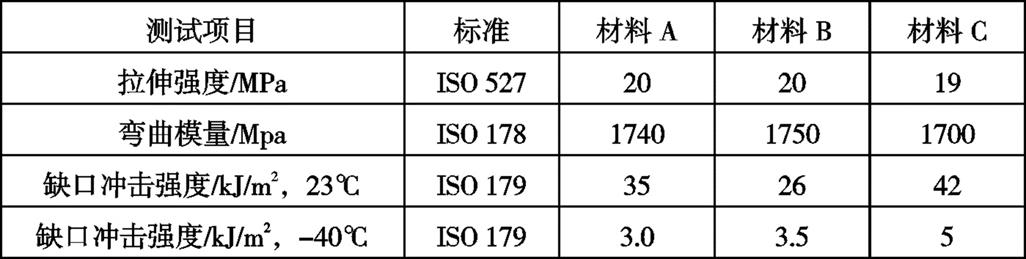2.1 试验材料准备根据薄壁低密度方案要求,优选3家供应商(记为A供应商、B供应商、C供应商)的PP+EPDM-T10材料作为开发对象,材料性能见表2(3家供应商材料分别记为材料A、材料B、材料C,对应的注塑门内饰板分别为门内饰板A,门内饰板B,门内饰板C,门内饰板均在相同条件下注塑而成)。 表2 原材料物性表