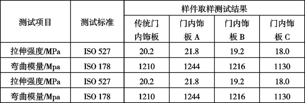 普通低密度改性PP材料模量很难达到1900MPa以上,而通过产品结构设计也可以增强刚性,以减小对材料刚性的依赖;但壁厚太薄,对产品设计和生产工艺要求较高,带来较大的潜在风险;通过综合考虑,对薄壁化+低密度方案,我们最终建议门内饰板壁厚设计为2.3 mm,相比于传统的2.5 mm,壁厚减小0.2 mm;而材料采用高模量的PP+EPDM- T10材料(弯曲模量在1700MPa以上),替代传统的PP+EPDM-T20材料。 2 性能验证薄壁低密度PP材料目前还没有可参考的性能标准要求,因此对于该材料的性能验证,我们通过以下途径解决:分别从传统门内饰板和薄壁低密度PP材料门内饰板上截取标准试样(取样部位尽可能平整,且位置一致,同时要避开背部加强筋、焊接柱等结构),在进行相应测试;评判原则:薄壁低密度PP材料门内饰板上取样测试结果不得低于传统门内饰板上取样测试的结果。