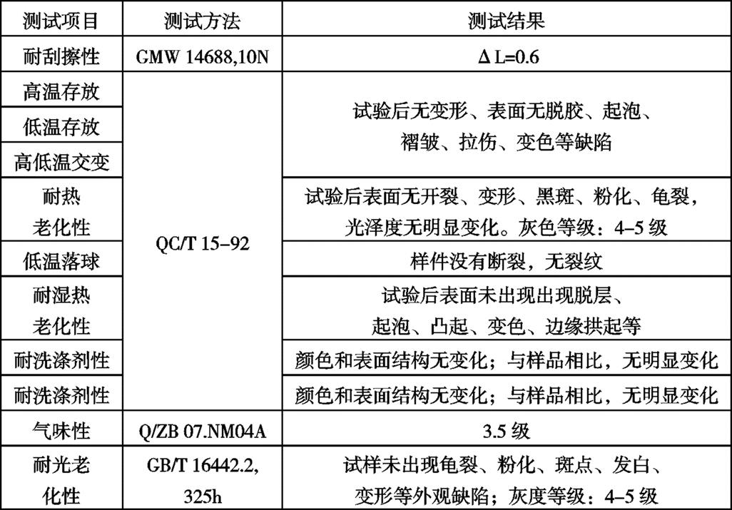 2.3 零部件性能的验证根据相关标准对门内饰板A进行耐刮擦、高低温交变、老化等零部件级性能验证,试验结果见表4。 表4 零部件性能试验结果