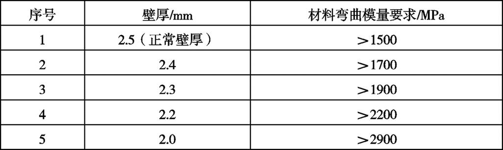 1 轻量化方案选择当前门内饰板相对成熟的轻量化方案主要有:薄壁化设计、低密度材料及微发泡技术;薄壁化设计和低密度材料方案一般对材料性能的要求较高[4],造成材料成本增加,且减重效果较低;而微发泡技术是通过对复合材料(如PP复合材料)进行微发泡处理,大幅降低材料密度,并保持一定的机械强度,实现轻量化[5],减重可达20%以上,但前期模具和生产设备费用投入高达千万,限制其应用。 针对上述轻量化方案存在的不足,特提出薄壁化+低密度相结合的方案,将低密度PP材料替代传统PP+EPDM-T20应用在薄壁门内饰板上,在不增加零部件综合成本的情况下,最大程度地实现减重。 根据转动惯量和挠度的理论计算得出[6],E1/E2=(d2/d1)3,即产品壁厚的微小降低,会造成产品的刚性大幅降低,而为满足产品刚性要求,则要选用高模量材料;不同壁厚,材料弯曲模量要求见表1。 表1 不同壁厚门内饰板对材料弯曲模量的要求