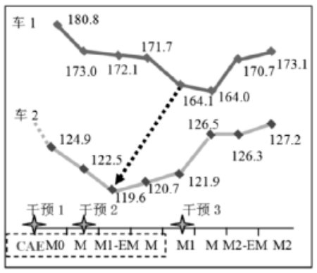 由于不同阶段的汽车车身轻量化管理有不同的特点,因此还应该重视对其曲线的走势分析。如以两款车型为例获得图1 所示的轻量化曲线对比图,分析发现M0 后两款车重量均下降明显,车2 的最低点要比车1 提前2 个节点,CAE 轻量化工作结束于M1 之前,变化明显的位置与管理干预有关,且越早干预最低点越提前。故车型轻量化曲线的走势会受到管理的影响,这也提醒我们要有计划、有目的加以合理管理和干预[3]。同时分析M0-M2 的理想轻量化曲线得到整个曲线中M0 处于最低点,虽然允许曲线波动但在整体上看必须先升后稳,不过这一理想曲线会受到干预时间、管理方式、项目成熟度等多个因素的干扰,M0 点的存在既能保证车身轻量化设计最优,也能在一定程度上体现某企业轻量化技术以及管理质量的高低,这就要求我们认清现实,发现问题,解决问题,为汽车车身轻量化管理提供有力的参考。