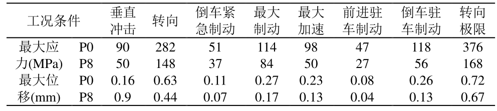 结果表明,在相同载荷施加方式和工况条件下,改进后P8转向节模型的最大应力值及最大位移值远低于P0模型(如图 4、图 5,表4所示),达到产品强度的要求,其结构优化效果明显。而且由于铝合金的密度较小,改进后单件转向节的重量能减轻48.7%,实现了轻量化的目的。