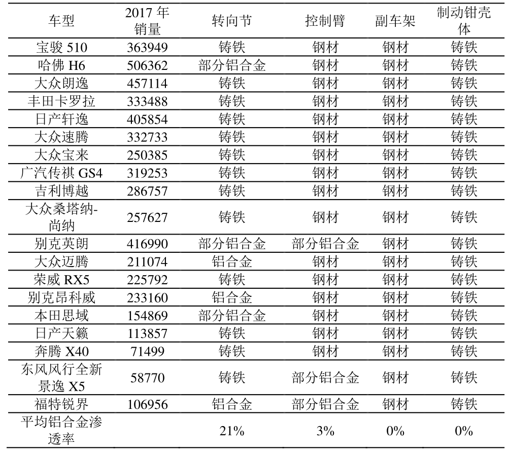 表1 普通品牌主要典型车型2017年款的底盘材质情况
