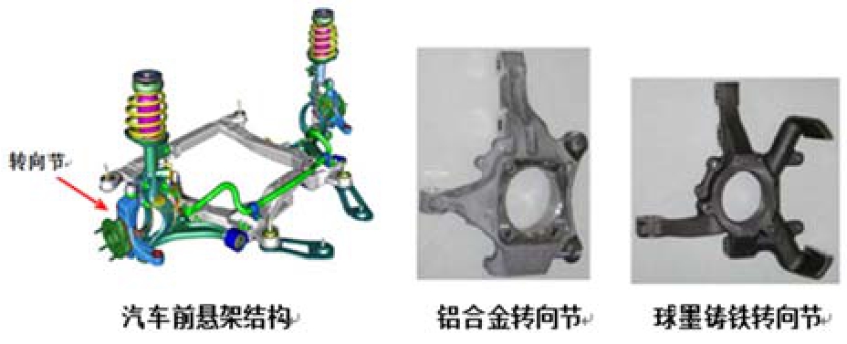 2 铝合金底盘轻量化产品汽车底盘铝合金轻量化的代表产品有转向节、控制臂、副车架及制动钳等,属于底盘安全件,产品性能要求高,轻量化不能以简单的减重多少来衡量,必须要与产品功能相关,安全法规要求必须用提高汽车主动安全性和被动安全性的眼光来完善汽车的安全设,由于当前工艺的限制,这在一定程度上限制了铝合金在底盘上的使用率。
