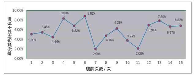 ④造成焊缝表面波浪是由于保护镜片污损,导致能量分布不均,送丝机出丝不稳(电动机电流过高等)。应更换保护镜片,检查送丝机工作状态。 ⑤造成焊缝首尾端多丝是由于未能正常激光剪丝,起弧点关光延时和关丝延时设置不当。应考虑用机械剪丝代替激光,调整起收弧处关光延时和关丝延时。 ⑥造成焊缝表面鳞状堆积是因为送丝量过大,与功率不匹配。应适当降低送丝速度。 ⑦造成连续间断性漏焊是因为光斑焦点位置偏离,机器人焊接姿态不当,激光光斑直径过小。应调整光斑尺寸及位置,调整机器人姿态。 ⑧造成连续焊偏是因为光斑能量分布不均,导致焊缝一侧未焊上。应调整光斑位置及大小尺寸。 ⑨造成瘤状假焊是因为:钢板预热不足,焊丝能量吸收不足;机器人焊缝跟踪姿态不当;光斑对中不好,光能量不能正常熔化焊丝。应调整焊机预热电流,调整机器人焊缝跟踪姿态,调整光斑对中。 ⑩造成咬边是因为咬边处能量密度过大,光斑两侧能量不均匀。应适当减小能量密度,调整光斑位置及尺寸大小。 通过以上方案对策的实施,激光焊接质量得到了稳步提升,气孔等平均不良率在6%以内,其他轻微缺陷不良率控制在0.3%以内(图4)。