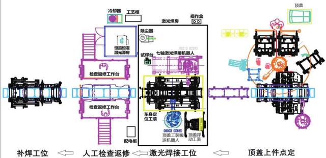 图2 车身激光焊接平面布置 (4)补焊工位:预留补焊工位,在激光钎焊后,完成顶盖剩余焊点的补焊工作。