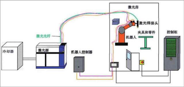 1.激光钎焊系统的构成激光钎焊工艺系统主要包括激光源、激光光纤、激光焊接头、冷却器、机器人系统、激光焊房、自动化控制柜、工装夹具、抽风系统及送丝机等(图 1)。