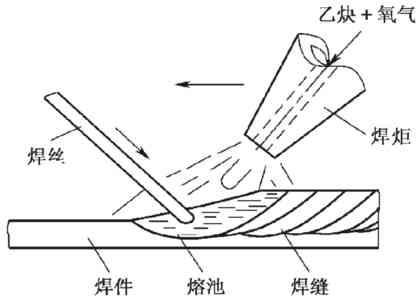 2.2 气焊气焊与手工电弧焊不同,它是将可燃气体与助燃气体在焊炬混合后引燃后,利用产生的高温火焰作为热源将焊件和焊丝融化,形成熔池待冷却后形成焊缝的一种焊接方法。其原理示意图如图2。 由于气焊的热源产生的热能有限,所以气焊一般用来焊接一些较薄的钢板或者熔点较低的材料。在汽车钣金作业中,气焊是常用的方法之一。