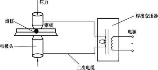 2.5 工频电阻焊电阻点焊是对金属板材装配成搭接接头,利用电流流过电阻(工件)时产生热量(Q=I2Rt)熔化母材金属形成熔核最终形成焊缝的一种焊接方法。其工作步骤主要分四步:1、加压;2、保持;3、通断电流;4、泄压。其原理图如图4所示: