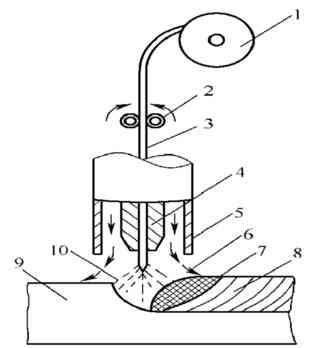 图2 气焊原理图 2.3 气体保护焊熔化极惰性气体保护焊,是以连续送进的焊丝作为熔化电极,采用惰性气体作为保护气体的电弧焊方法,简称MIG(Metal Inertia Gas)焊。其原理示意图如图3: