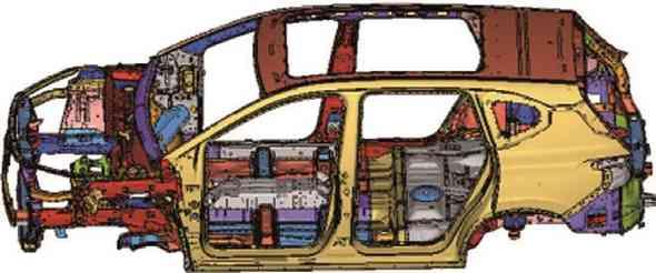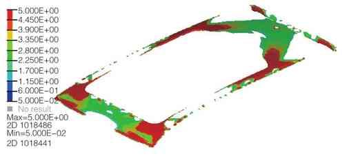 4.4 整车强度为评估碳纤维顶盖的整车强度性能表现。将顶盖外板由钣金件换成碳纤维材料,分析其整车强度应力,并与原状态对比,评估其风险及安全性能,见图5。 仿真结果显示,碳纤顶盖方案相比量产传统钣金方案,整车整体应力水平变化较小,满足整车强度要求。