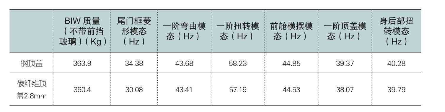 4.2 白车身模态分析对不同的顶盖材质(钢、碳纤维)及其板厚进行白车身模态分析。 仿真结果如表2所示,表明碳纤维顶盖对尾门菱形框模态下降4.3Hz;弯曲、扭转、前舱横摆、顶盖等模态稍有降低。