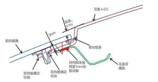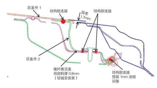 3.1.2 顶盖与天窗总成匹配方案 如图2所示为碳纤维顶盖与天窗胶条匹配截面,将两者局部的料厚t设计为1.3mm;同时碳纤维顶盖与天窗加强框用结构胶连接。