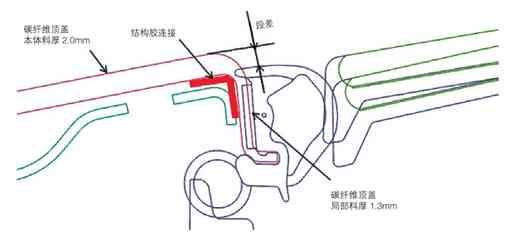 3.1 碳纤维顶盖结构设计优化3.1.1 顶盖与前挡玻璃总成匹配截面 如图1所示,碳纤维顶盖与前挡玻璃面厚度与本体做成一致,厚度为2.0mm。为消除成型负角,将前端立面设计为Z向5°,前端呈“V”形口。同时碳纤维顶盖与顶盖前横梁用结构胶连接,避免损害部件。搭接面预留1mm涂胶间隙。
