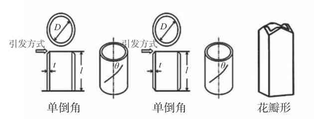 2.2 诱导结构复合材料圆柱壳吸能结构的一个重要应用是在车辆碰撞安全领域[11]。为保证车辆的碰撞安全,在发生事故时,车身应以一定的方式破坏。如图4 所示。为提高结构的耐撞性能,设置一种合理的诱导机制使碰撞能的耗散尽可能以一种可控制、可预见的方式进行[12]。