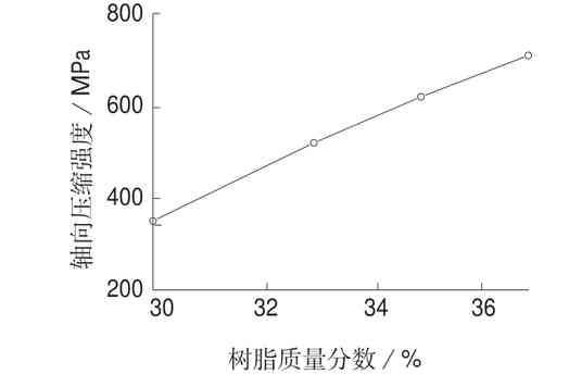3.2 基体与界面的影响树脂基复合材料具有比强度高、比模量大、抗疲劳性能好等优点,在复合材料结构中支持和固定纤维材料,传递纤维间载荷[53]。以环氧树脂为例,具有良好耐水性、耐电性等优点,特别是优异工艺操作性而被广泛使用。陈永刚等[49]对比了5288 和5268 环氧树脂为基体的两种复合材料薄壁管的力学性能。郑志才等[53]研究了不同环氧树脂含量对复合材料管轴向压缩强度的影响,如图9 所示。从图中可以看出适当的增加树脂含量有利于提高管件的轴向压缩强度。李世超等[54]以碳纤维增强环氧树脂基复合材料为研究对象,研究其在超低温情况下的力学性能,为纤维增强复合材料在特定情况下的应用提供理论依据。已有研究表明基体的极限应变越大,脆性纤维增强的复合材料能量吸收能力越强,而纤维增强复合材料的能量吸收能力越弱。