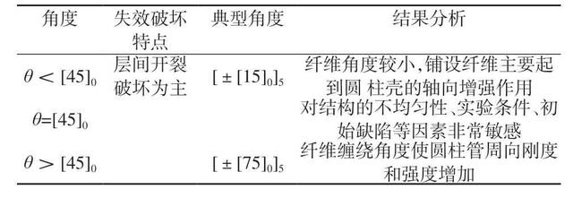 图7 不同纤维铺层角度对比吸能的影响 复合材料管件结构的比吸能随纤维铺设角度的变化而改变,这主要是由于不同纤维缠绕角下壳体的轴向和径向刚度不同,导致管件在轴向冲击荷载下破坏模式和损伤机理不同。因此针对具有典型破坏过程的[±θ]5(θ=[15]0,[30]0,[45]0,[55]0,[65]0,[75]0)试件的能量吸收能力进行了对比分析,见表1。 表1 典型纤维铺设角度的失效特点