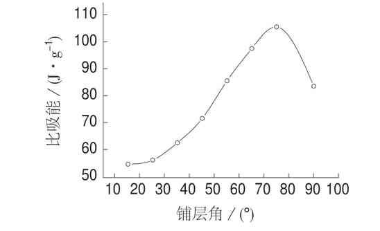 2.4 铺层结构影响纤维增强复合材料薄壁件变形模式和压溃载荷水平的因素有很多,其中纤维铺设角度和纤维铺设顺序对复合材料的能量吸收特性影响较大,因此在工程设计中得到了广泛的重视[33-34]。 纤维铺设方式的不同导致复合材料的轴向刚度不同,从而产生了破坏模式与破坏机理的差别。G. L. Farley[35],R.Keal[36]和D. Hull 等[37]研究了玻璃纤维增强聚酯基圆管随纤维铺层角度改变对比吸能的影响,发现,当纤维铺层角度小于[65]0 时,比吸能与铺层角度成正比,高于[65]0 时比吸能与铺层角度成反比。龚俊杰[38],罗敏等[33]研究了多个角度的纤维复合材料管在不同轴工况下的损伤影响,发现随着铺设角度θ 的增大,纤维方向和圆管轴向之间的夹角增大,圆管轴向刚度下降,初始峰值载荷降低。解江等[39]分析了不同纤维铺层角度对复合材料薄壁圆管轴向压溃吸能特性的影响规律。结果如图7 所示。当纤维铺层角度从[15]0增加到[90]0,在准静态轴向压溃下薄壁圆管的比吸能先增大,[75]0 之后会有一定程度减小,但比吸能值仍然相对较大。