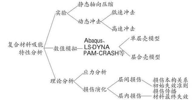 图1 复合材料管常见变形模式 从试验、数值模拟、理论预测等方面考虑,根据纤维增强复合材料薄壁件在轴向压缩下的工况要求,采用MTS 或WDW 等测试系统对试件进行轴向压缩实验。以实验为基础,建立相应的理论预测与有限元模型,通过实验与仿真的结果对比,验证仿真的可行性,并对纤维增强复合材料薄壁件的能量吸收影响因素和影响规律进行系统总结,为结构的耐撞性设计提供依据。复合材料吸能特性分析如图2 所示。