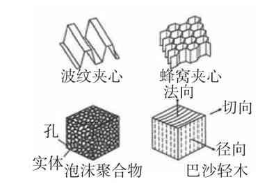 图10 不同混合形式的铝/CFRP 混合圆管 对于金属/CFRP 混合管来说,CFRP 结构的不稳定局部屈曲失效模式可以通过金属管的限制转变为渐进式失效模式,而金属管又因为CFRP 结构的增强提升承载能力,从而改善整个混合结构的能量吸收能力。 而纤维增强复合材料夹芯结构,是复合材料的一种特殊形式,是由具有高强度,高模量的蒙皮与低密度夹心结构通过整体一次成型或者胶接二次成型[69],研究表明充分利用两者的优势可以实现整个结构的性能提升。 目前纤维增强复合材料夹心结构广泛应用于汽车碰撞装置、军用直升飞机坠落保护装备和航天器软着陆配件等领域。根据使用芯材的种类,可以分为泡沫夹芯结构,蜂窝夹芯结构,巴莎轻木夹芯结构以及异型芯材夹芯结构[70],如图11 所示。