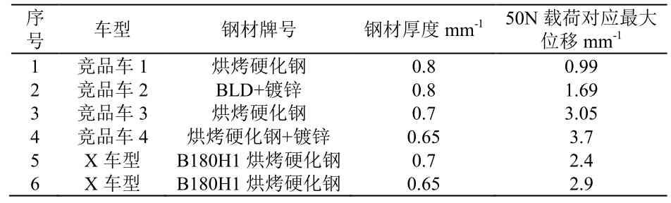 通过对国内外多款车型的表面抗凹性实物测试,测试结果见表4。可以看出,轻量化改善后的车门外板表面抗凹性处于行业内中等水平且满足设计要求。