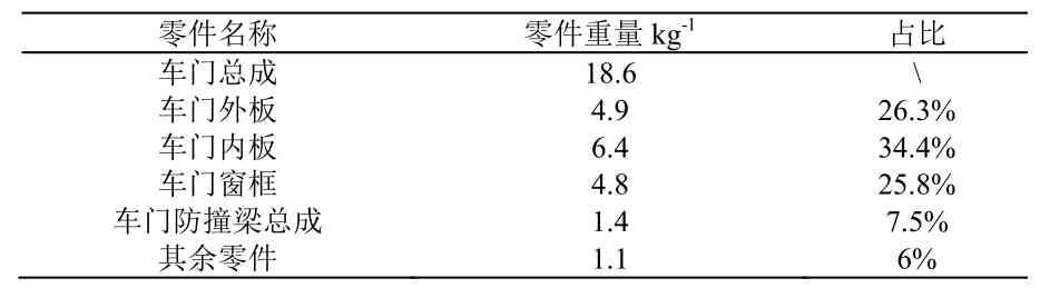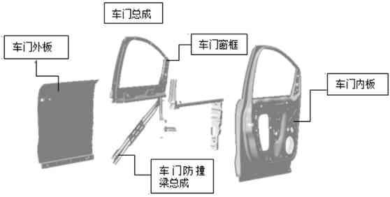 车门内板、车门外板、车门窗框总成、车门防撞梁总成零件占据车门总成重量的绝大部分,车门的轻量化可优先考虑在上述零部件上着手。