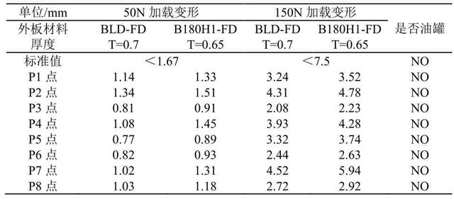 对比分析前后车门优化前后两种状态下,车门表面抗凹性分析结果,采用烘烤硬化钢减薄后,表面抗凹满足设计要求,具体对比结果见表2和表3所示。