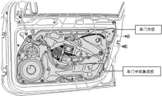 集成的部分内板材料可采用玻纤增强的塑料材料或者铝合金轻质材料,集成化装配,相比钢制车门,塑料集成化的车门玻璃升降器安装板能够实现局部的零件重量降低。如图4所示,车门内板中部区域采用与玻璃升降器集成一体的塑料板或者铝合金替代。