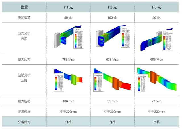 2 现有产品的性能分析GB26511-2011《商用车前下部防护要求》规定了商用车前下部防护装置的碰撞试验方法和性能要求。主要对商用车前下防护装置进行三个点(P1、P2和P3)进行碰撞测试。要求如下: (1)位置要求:如图2所示,P1点位于前轴轮胎最外侧(不包括轮胎的变形量)相切的纵向平面200mm处;P2点对称于车辆的纵向平面中心两侧,两P2点相互之间的距离为700-1200mm;如果与前下部防护相关的车辆的结构和部件位于完全与其纵向中间平面对称的位置,则在各P1和P2点上的试验应在一边上进行。详见上图2。 (2)加载要求:加载力平行于车辆的纵向中心平面,水平施加在各点上。加载头尺寸不大于400mm(宽)×250mm(高),试验时应尽可能快施加作用力,装置应经受住至少0.2 s的作用时间,P1、P3点施加80 kN,P2点施加160 kN。(客户要求) (3)实验完成后,横梁变形不能超过200mm(客户要求)。 根据现有产品的数据,采用Abaqus有限元软件,对其碰撞性能进行分析,分析边界条件及参数如右图3示。Abaqus软件通过Expilcit求解器进行分析,详细分析结果详见表1。 从仿真结果可以看出,各试验点满足标准要求,但其应力最大值达到769Mpa,需要采用高强钢材。因其工艺采用冲压及拼焊工艺,因此导致整体横梁重量达到29Kg。