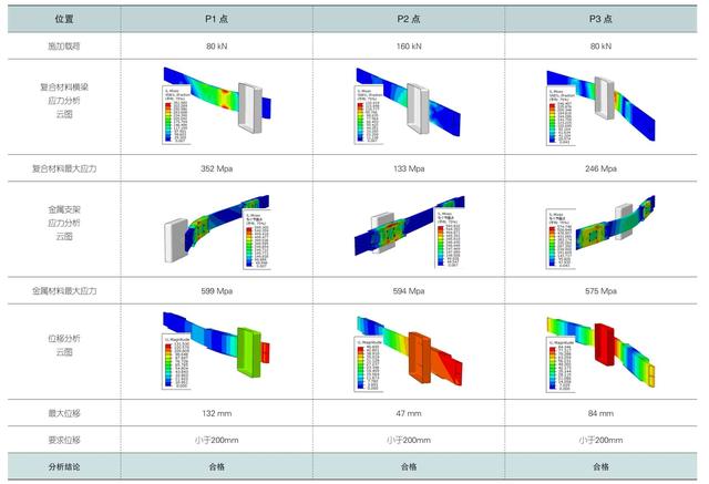 3 采用复合材料轻量化设计的前下部保护装置为实对现有产品重量的优化,首先对现有产品的受力结构进行初步分析。从表1可以看出,支架和横梁的连接位置是受力集中部位,承受比较大的应力集中,而横梁本身利用金属材料的塑型形变吸收一部分撞击能量,其余部分通过连接处转到支架及车身上。因此轻量化的总体思路是,采用复合材料的横梁减轻产品的重量,同时设计两个金属连接件负责连接复合材料横梁与金属支架,同时承担集中的应力(因为复合材料不能承受太高的应力),以及塑性形变吸能的功能。 根据此思路经过反复优化,最终形成下图4的设计(只优化了横梁部分): 优化后的设计界面为“日”字型,这样做是为了兼顾产品的抗弯曲性能和工艺性能,详见图2。在原有横梁结构的基础上,左右各增加一个壁厚为2 mm的金属连接件,与横梁通过高强度聚丙烯酸类结构胶粘连接。横梁部分总重量约为12.5kg(非金属件+金属件+结构胶),相对于原设计降低重量达57%,降重效果明显。 通过Abaqus Expilcit求解器进行碰撞仿真,结果显示P1、P2、P3位置均满足GB26511-2011《商用车前下部防护要求》中的相关性能要求以及客户要求。仿真分析显示,非金属部分最大应力为352Mpa,属于复合材料能够承受的应力值。金属材料应力最大为599Mpa,基本与优化前的方案相当。因此本方案在性能相近的情况下,成功降低产品重量50%以上,达到了预期的设计目标。详见上表2。 表2 复合材料轻量化设计的前下部保护装置 各实验点位置仿真分析