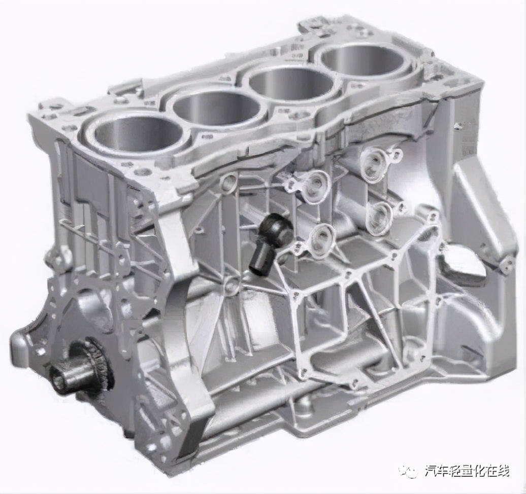 2.1 铝合金材料铝合金具有低密度的特点,强度甚至可以媲美优质钢。按不同的加工性能,可分为铸造铝合金和变形铝合金2 种,第1 种熔点低、流动性能良好,通过重力铸造与压力铸造等方式实现复杂形状零件的成型,主要应用于汽车的发动机(如图1 所示)、传动以及行走系统;而第2 种强度高、塑性好,主要有2XXX 系、5XXX系和6XXX 系,应用于汽车结构件、装饰件和散热系统。
