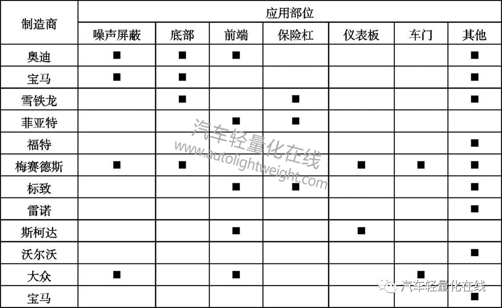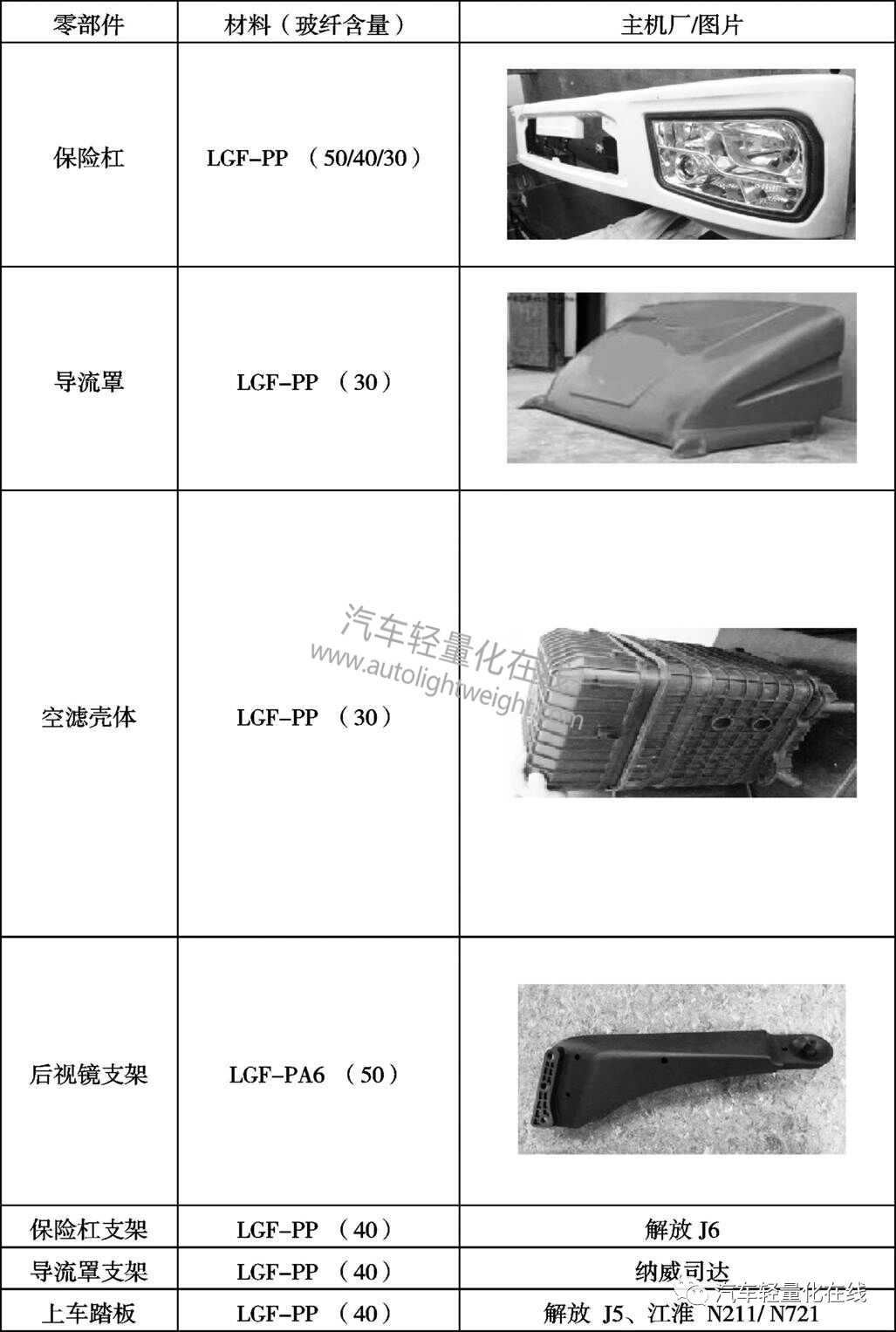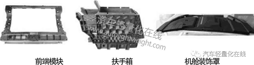 1 国内外发展及应用情况LGF在汽车、航天、体育、家电、包装等领域广泛应用,其中汽车行业是LGF应用的主要领域,约占80%[2]。LGF最早在欧美投入使用,代替部分金属材料,应用在汽车前端模块、保险杠、仪表板、脚踏板、散热风扇、空调风扇等零部件,如图1。目前,在汽车行业,欧美 LGF 的消耗量仍占主要比例,LGF在欧洲品牌汽车的应用情况如表1[3-4]。  图1 LGF零部件 表1 LGF在欧洲品牌汽车中的应用  表2 LGF在商用车上的应用  LGF在我国起步较晚,目前,国内较多厂家已对LGF进行开发,如上海耀华大中新材料有限公司、广州金发科技股份有限公司、上海普利特复合材料股份有限公司、合肥杰事杰新材料股份有限公司等。LGF在商用车的应用情况如表2。 除此之外,LGF在重卡后视镜支架、雨刷、电池托架等其他零部件上都有应用。